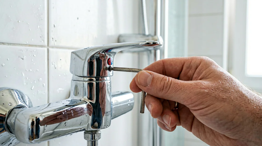 Pour démonter un mitigeur de douche apparemment sans vis, repérez la pastille de couleur (rouge/bleu) ou le cache décoratif sur la poignée. Retirez-le délicatement avec une lame fine pour révéler la vis pointeau (vis sans tête). Desserrez-la avec une clé Allen de 2,5 ou 3 mm. Si aucun cache n'existe, la poignée est probablement clipsée : tirez fermement dans l'axe.