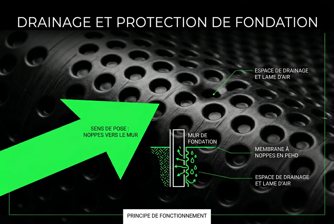 Vous êtes devant votre mur de soubassement, la pelle mécanique est prête à remblayer, et soudain le doute s'installe : dans quel sens fallait-il poser cette fichue nappe à excroissances ? Pire encore, vous réalisez que votre maçon a plaqué la face lisse contre le mur, les picots fièrement dressés vers la terre.